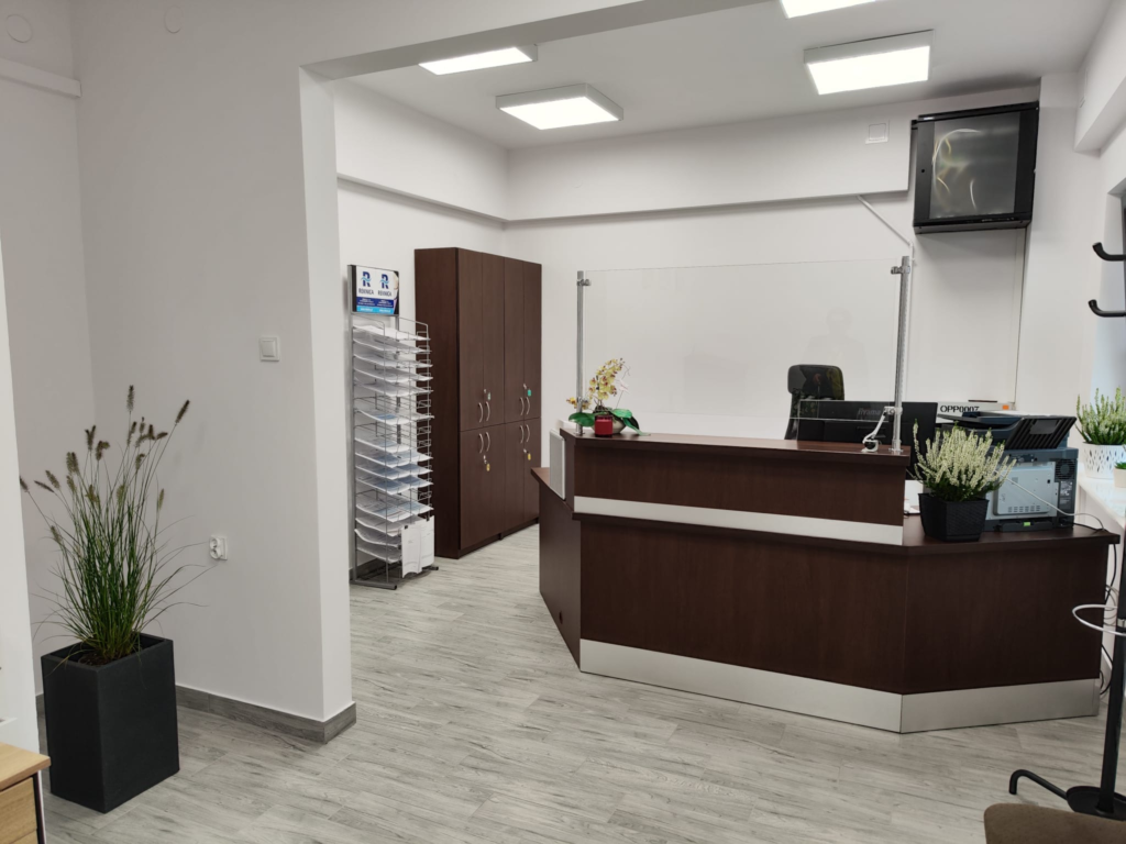 Nowoczesne wnętrze biura zostało zaprojektowane z myślą o Państwa wygodzie oraz sprawnej obsłudze. Oferujemy przestrzeń do komfortowego oczekiwania oraz stanowiska obsługi, które pozwalają na szybkie i efektywne załatwienie wszelkich formalności. Ponadto, biuro jest wyposażone w automatyczny dystrybutor do dezynfekcji rąk oraz inne udogodnienia dostosowane do potrzeb osób o ograniczonej mobilności.